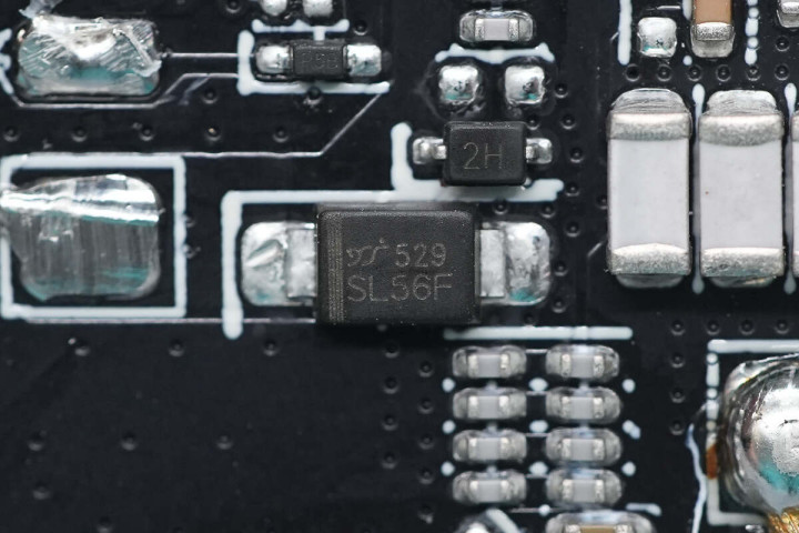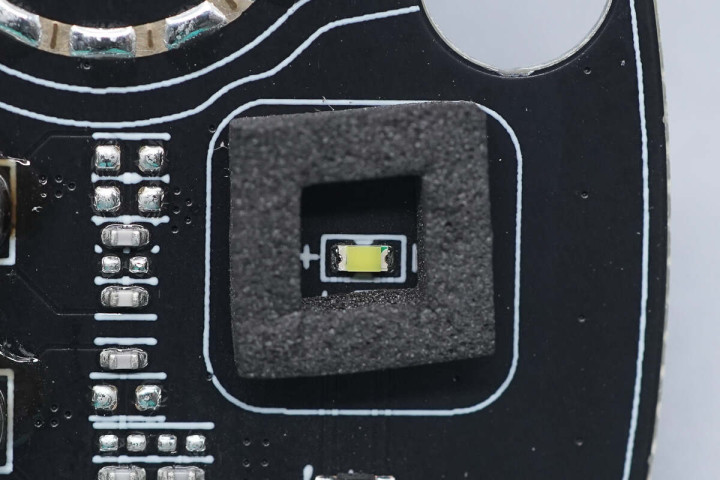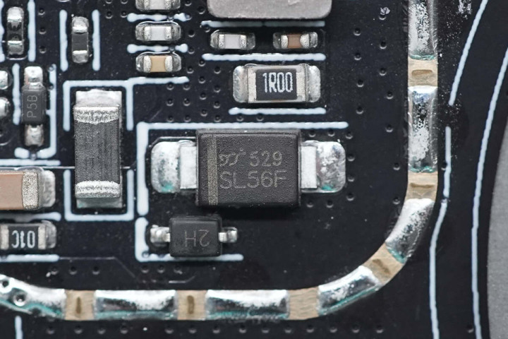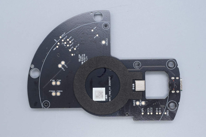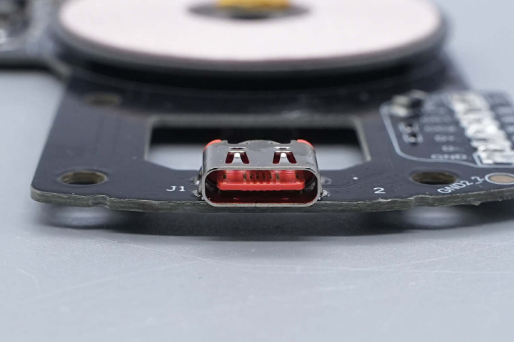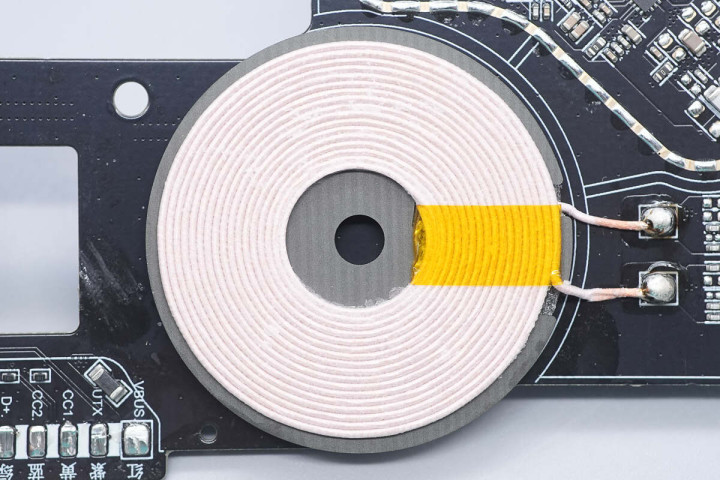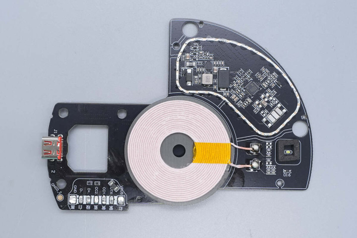 将PCB板分离,板子正面右上角区域设有反接保护二极管、同步降压转换器、降压电感、钽电容、无线充电芯片、NPO谐振电容等器件,此外还焊接有USB-C接口母座、无线充电线圈以及LED指示灯。