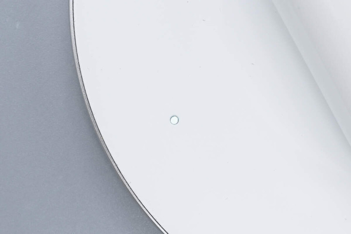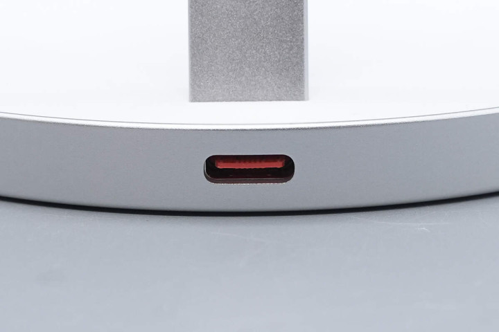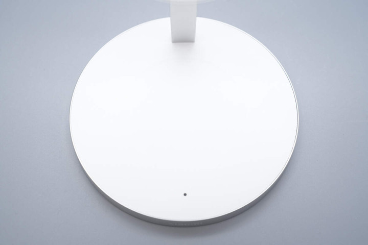 无线充底座圆盘造型设计,顶部采用硅胶材质盖板,并设计有耳机无线充电区域以及无线充电指示灯。