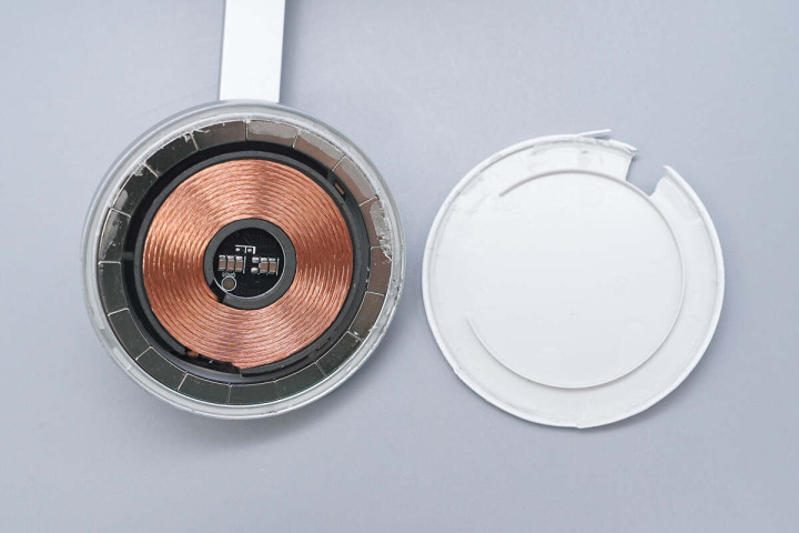 模块正面无线充电线圈和隔磁片置于塑料隔板内固定。