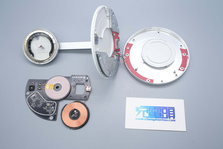 充电头网通过拆解了解到,产品基于伏达半导体NU1705A、NU1708A两颗无线充电SOC芯片进行设计,得益于超高集成度,两路无线充电路设计得到大幅简化。此外底座内部部件使用螺丝固定,磁吸无线充电板内部磁铁环也打胶加固,连接线芯等打胶水处理,做工到位。