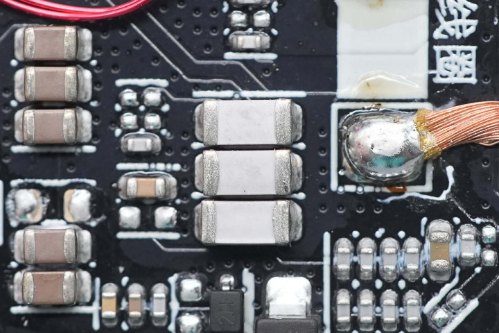 取出无线充电模块,连接线芯焊接到小板背面,同样也打胶水处理。