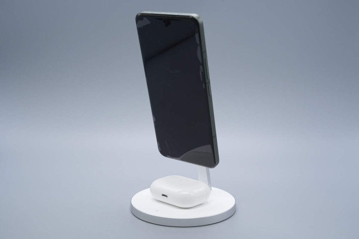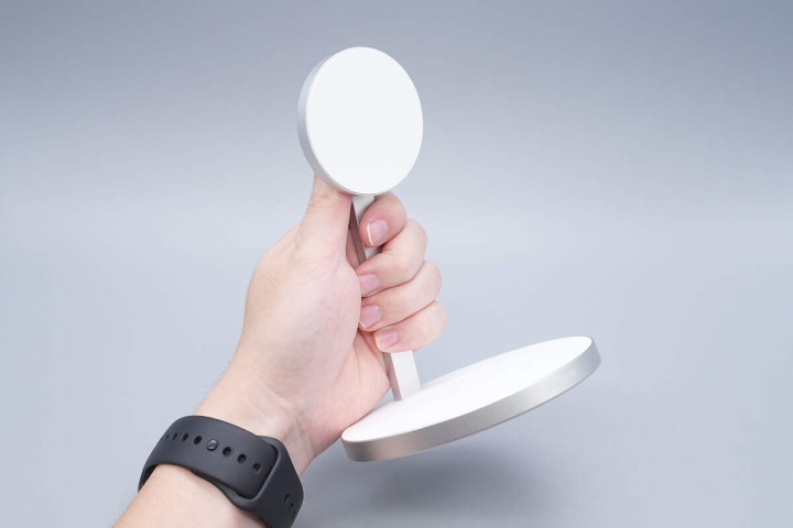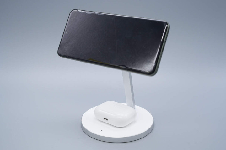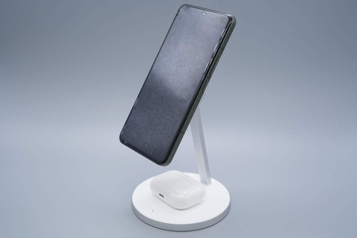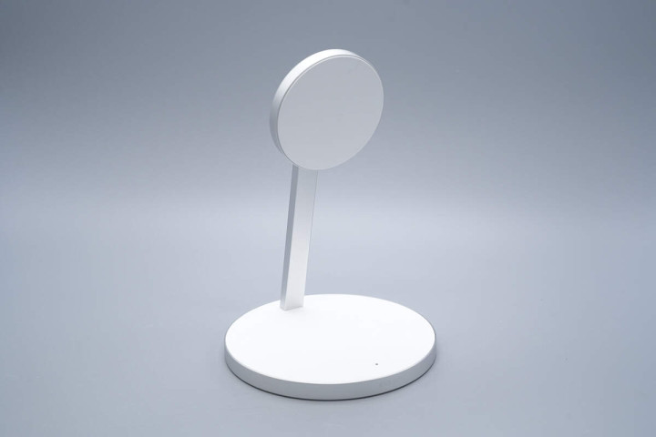 小米30W二合一磁吸无线充由底座、支撑杆以及磁吸无线充电板三部分组成,机身为铝合金+硅胶材质,银白色调,一体化极简设计,简约优雅。