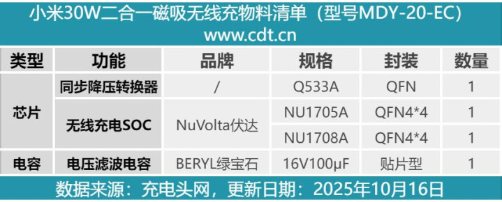 最后附上小米30W二合一磁吸无线充的核心器件清单,方便大家查阅。