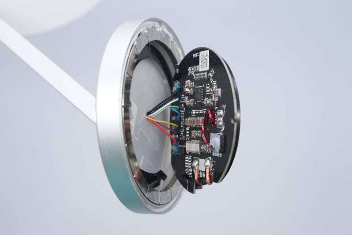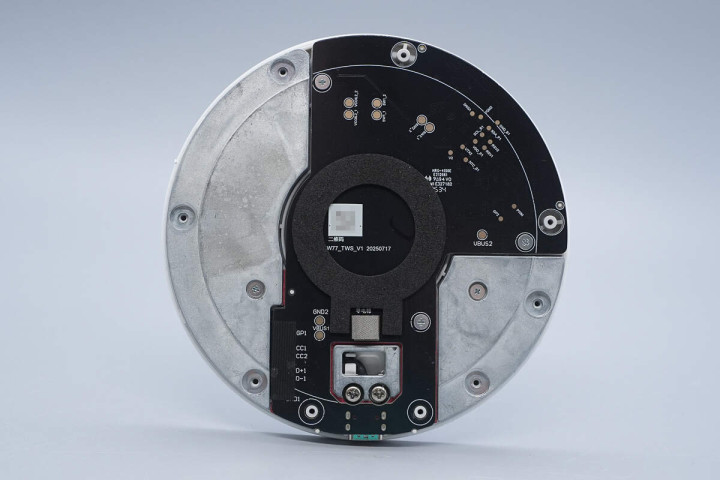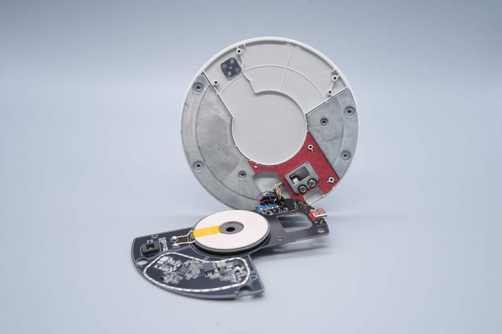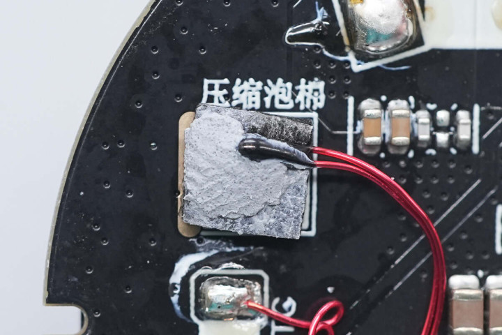 底座内部PCB板为不规则形状设计,剩余区域专门设有两块造型契合的配重铁用于提升产品稳定性。