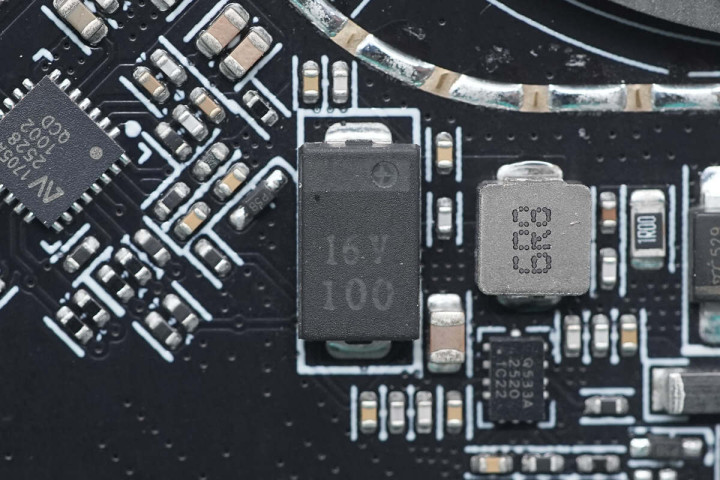 滤波电容来自绿宝石,为SV标准小型化系列叠层导电高分子铝电容器,规格为16V100μF,具有耐纹波电流能力好以及环保(符合无卤、RoHS和REACH规定)等特点,适用于服务器、笔记本电脑、人工智能、无人机、固态硬盘、无线充电器等应用设计。