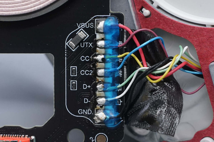 磁吸无线充电板通过一组线芯与底部PCB板锡焊连接,锡焊区域打胶水以及粘贴绝缘布胶带处理。
